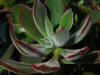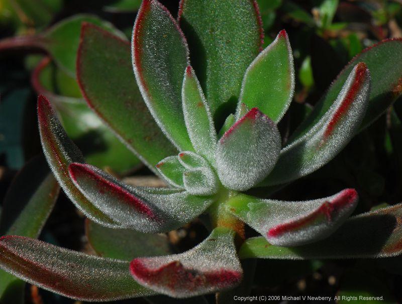 Echeveria pulvinata Rose ex Hook. f. Echeveria pulvinata, also known as Cotyledon pulvinata Hook, inhabits poor, well-drained soils in southern Mexico. The leaf tips are edged in a brilliant red pigment. But it's most distinctive feature is the velvety covering of fine white hairs that capture light in a way much like Cotyledon tomentosa. In Tucson, it requires some shade and enjoys summer Thunderstorms. The stems usually reach a maximum height of about 200mm, occasionally to 300mm under optimal conditions. It goes by the common name "Plush Plant". |