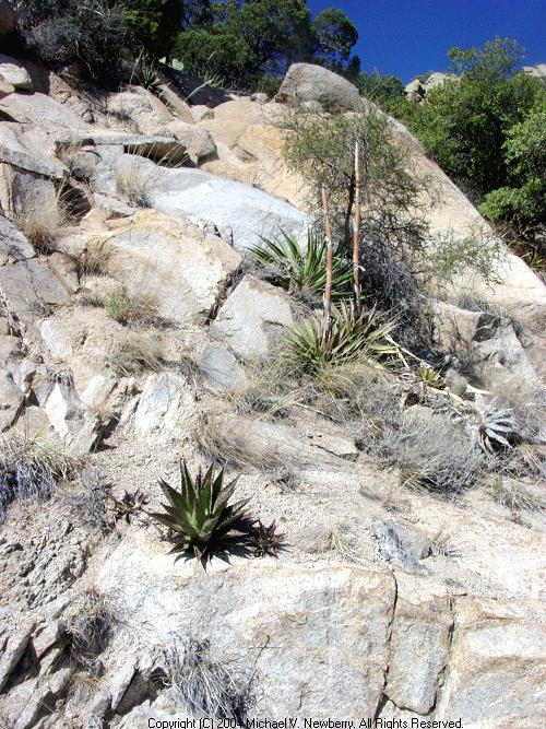 Agaves chrysantha (front), palmeri, and murpheyi (? in the background) growing on steep granite slickrock at 6,300 ft. Kitt Peak, Arizona. Notice the color differences. |